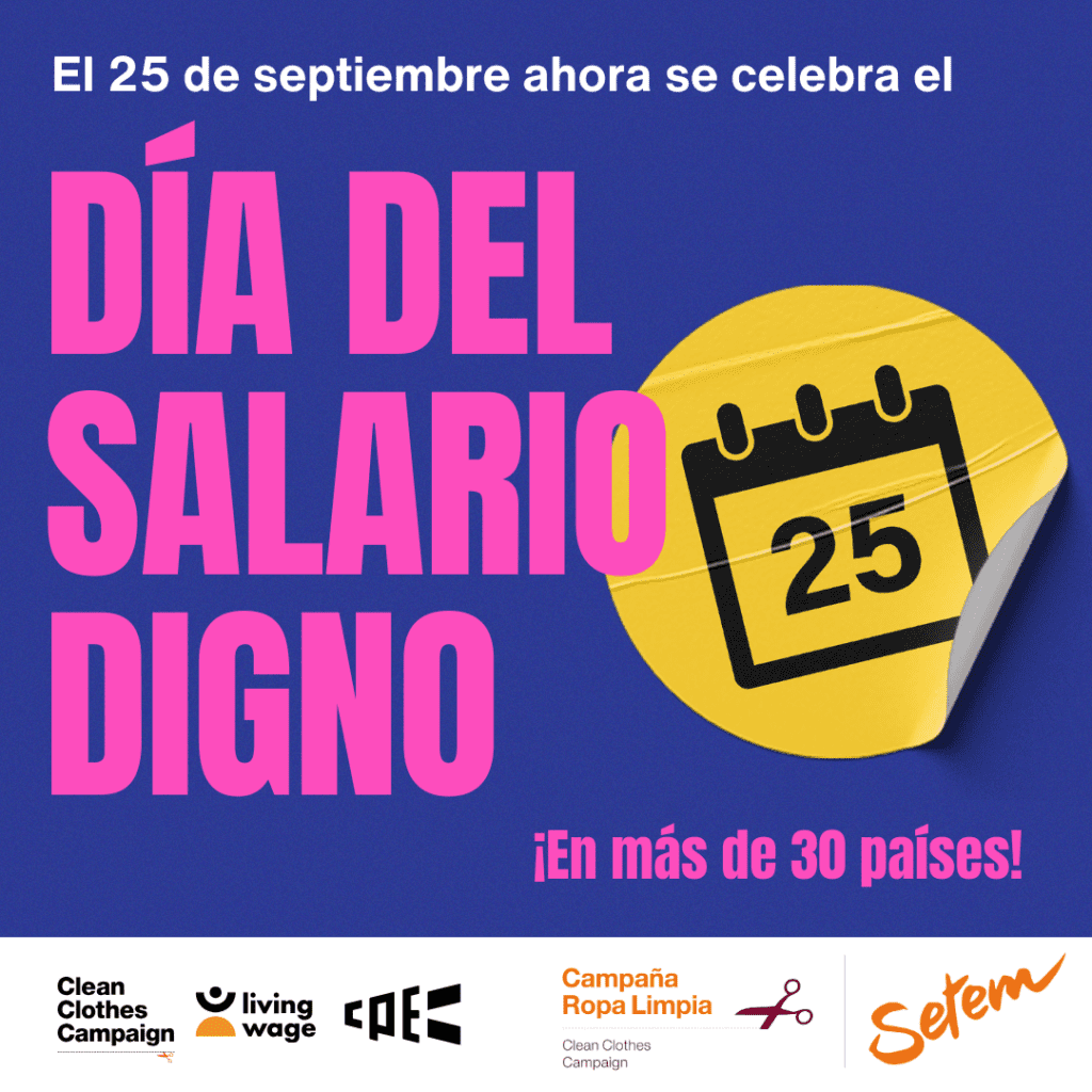 En este día, la Campaña Ropa Limpia hace un llamamiento a organizaciones, sindicatos y a todas las personas que creen que un salario digno para todos es necesario y posible, para que se unan a nosotros en la conmemoración del Día de Acción por un Salario Digno, el 25 de septiembre.