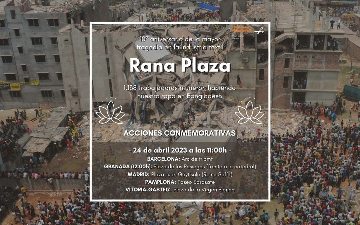 El 24 de abril -10º Aniversario del Rana Plaza- saldremos a la calle en cinco ciudades para celebrar acciones conmemorativas en recuerdo de las víctimas del derrumbe del Rana Plaza. Colocaremos una gran lona con los nombres de las 1.138 personas que murieron en Rana Plaza, flores, antorchas y, después de la lectura de un manifiesto, haremos un minuto de silencio. Detrás de la lona, situaremos una gran pancarta con el texto: