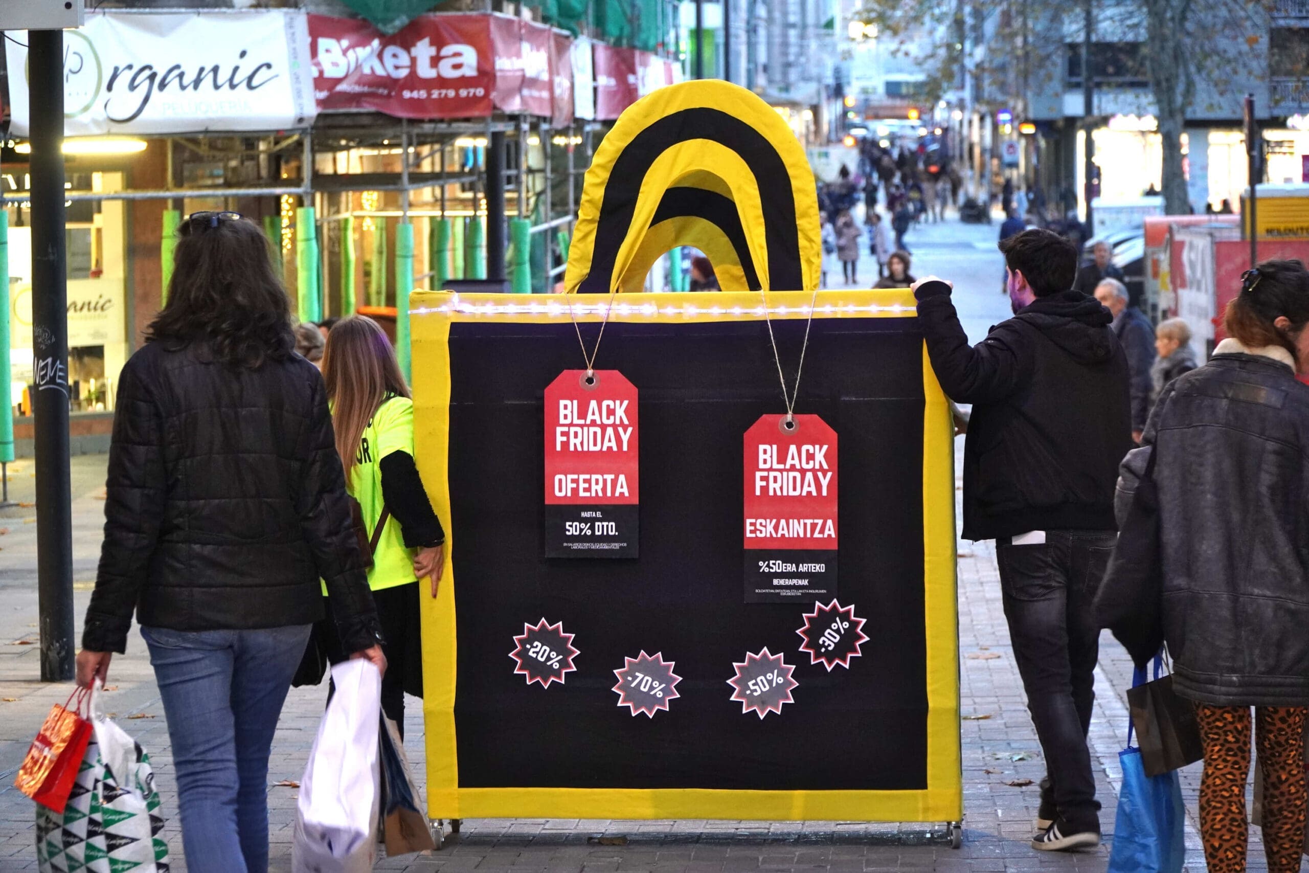 En Vitoria-Gasteiz activistas de Setem Hego Haizea salieron a la calle para denunciar el consumismo que inunda las calles cada año durante la campaña del Black Friday, el día más consumista del año, a costa de la explotación y vulneración de derechos que sufren millones de trabajadoras de la industria textil global, así como de la destrucción medioambiental que supone este modelo de negocio.