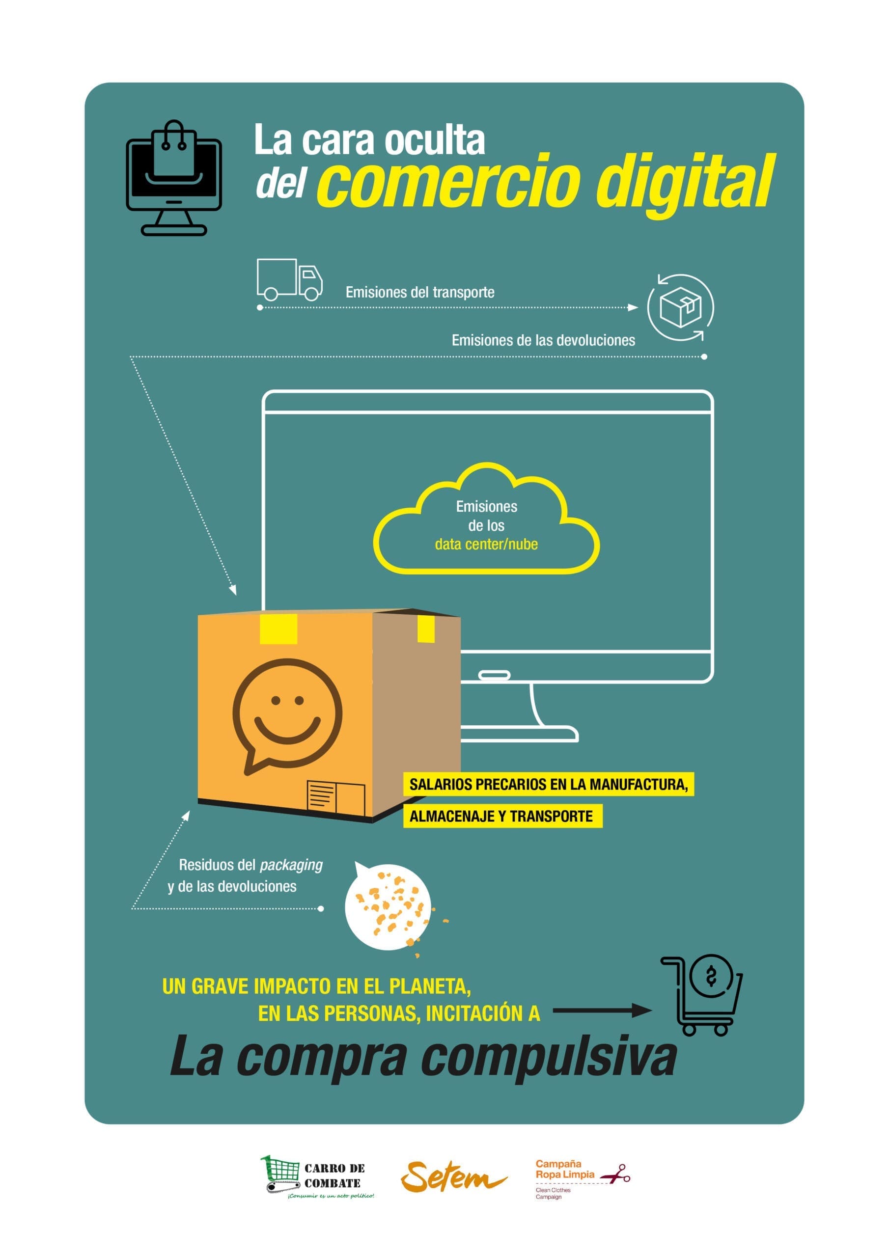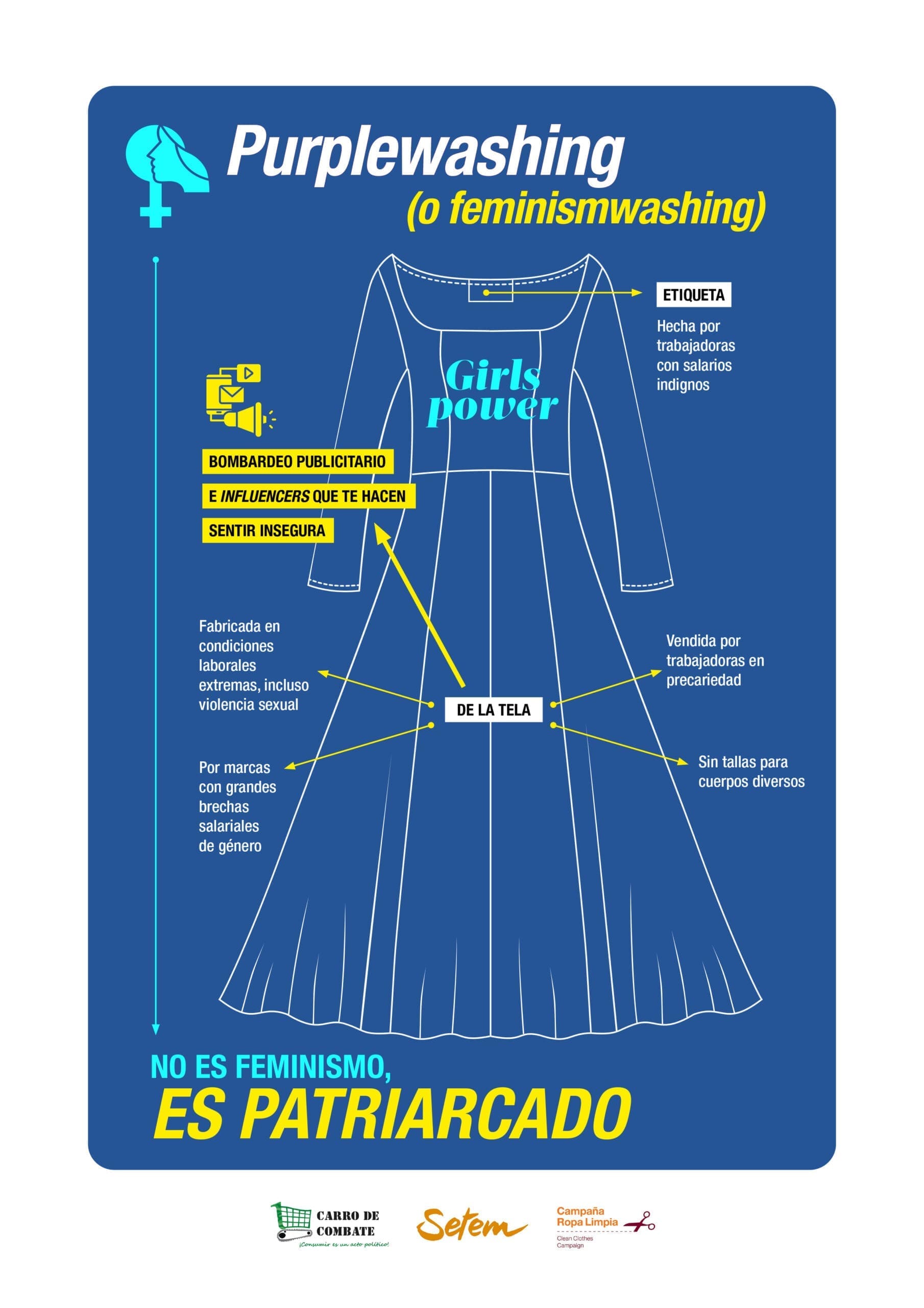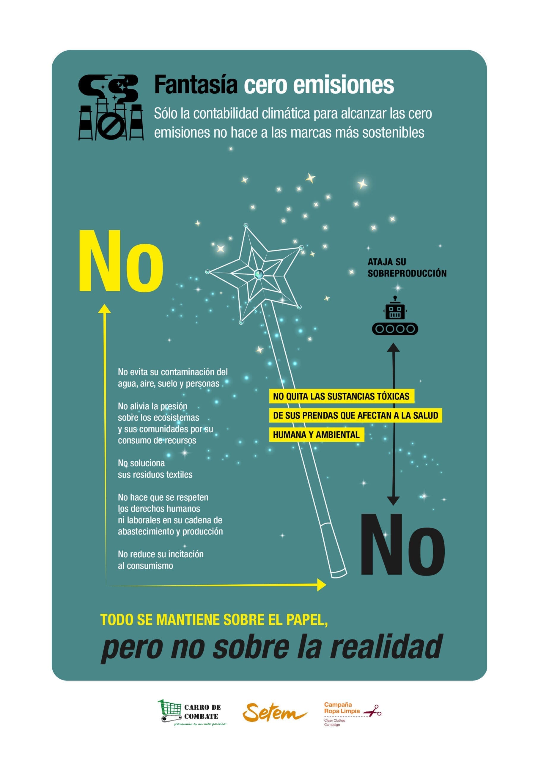Pero la mayoría de las personas consumidoras se sienten perdidas ante tanto despliegue publicitario. ¿Son realmente ciertos esos eslóganes? ¿Es mejor comprar en una gran marca porque asegura que reutiliza materiales? ¿Qué pasa con las prendas que depositamos en sus programas de reciclaje? Carro de Combate junto a Setem y la Campaña Ropa Limpia han lanzado una iniciativa de concienciación sobre algunos de los principales engaños publicitarios de las grandes marcas. En siete infografías analizamos algunos de los engaños más habituales, desde las estrategias de supuestas emisiones cero, que en realidad no solucionan el problema, a las proclamas feministas de sus camisetas fabricadas por mujeres en países del Sur con condiciones laborales abusivas, entre otros.
