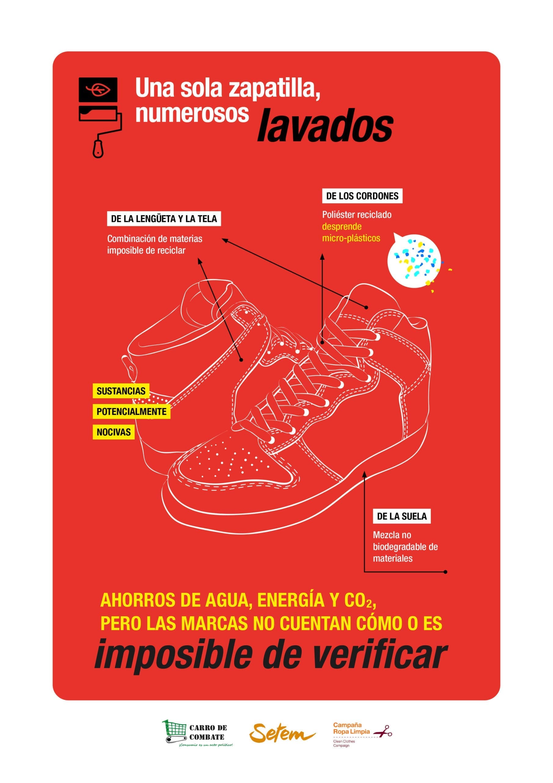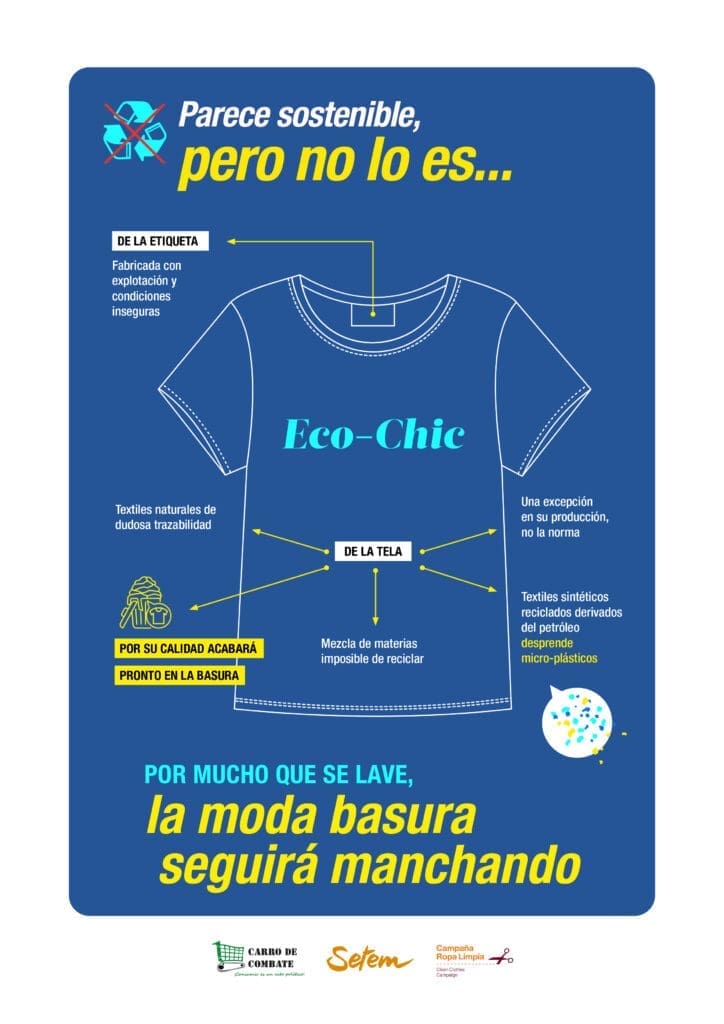 Las grandes marcas de ropa han abrazado el greenwashing para intentar convencer a las personas consumidoras de que están minimizando su impacto. A través de esta iniciativa de Carro de Combate, Setem y la Campaña Ropa Limpia hemos querido concienciar sobre las trampas publicitarias de la industria. El informe llevado a cabo por el colectivo periodístico Carro de Combate destapa los lavados de cara de la segunda industria más contaminante, a pesar de los mensajes publicitarios y de marketing de las grandes compañías. A través de una campaña lanzada en las redes sociales, las tres entidades han desvelado mediante unas infografías los puntos más destacados de esta investigación.