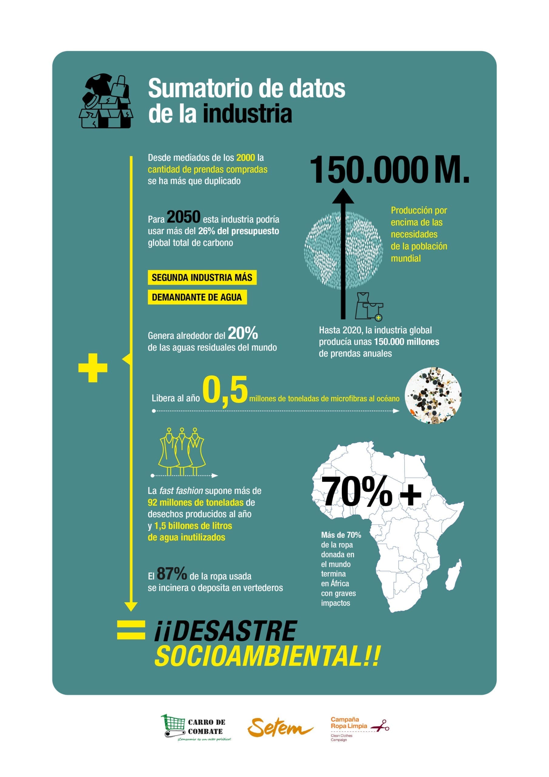 Las montañas de ropa del desierto de Atacama o de los vertederos de Kenia son algunas de las muestras más visibles del desastre socioambiental que supone la industria de la moda rápida. Pero no es el único. El sector es una de los mayores emisores de gases de efecto invernadero, superando a los vuelos internacionales y el comercio marítimo juntos. Supone más de 92 millones de toneladas de residuos al año y genera alrededor del 20% de las aguas residuales del mundo. Libera además medio millón de toneladas de microfibras al oceáno al año. Un huella demasiado grande como para que perdamos el tiempo con su greenwashing. No podemos permitir que nos sigan engañando.