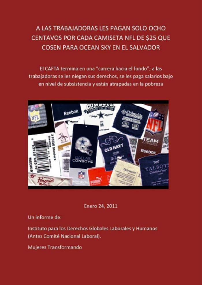 La investigación realizada por Mujeres Transformando, de El Salvador, documenta cómo a las trabajadoras se les niegan sus derechos, se les paga salarios muy bajos y están atrapadas en la pobreza. En la maquila Ocean Sky se les paga sólo 8 céntimos por cada camiseta de laLiga Nacional de Fútbol Americano que cosen, lo que significa menos del 1% de la venta de las camisetas, que es de 25 dólares.