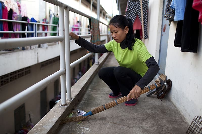 Nhean Sarun, de 36 años, barre el balcón de su habitación alquilada en Phnom Penh, Camboya. Lleva trabajando para ShenZhou, fábrica textil, unos cinco años. Antes de tener empleo aquí trabajó en la fábrica JRB durante tres años. Cada seis meses la contratan temporalmente, pero su salario siempre es el mismo. Aunque su salario base es de 61$ al mes, gana unos 110 o 120 por las horas extra. Todo lo que gana, tras cubrir sus gastos mínimos, se lo manda a su madre y a sus hijos, que viven en la provincia de Prey Veng.