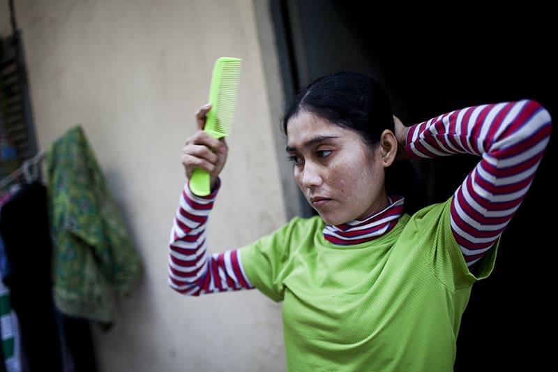 Sim Nak, de 33 años, se peina antes de trabajar en la modesta habitación que comparte con tres compañeras de trabajo en Phnom Penh, Camboya. Lleva trabajando 4 años en ShenZhou. La mayoría de los días de 7h a 16h, y después otras dos horas extra. Lo que no gasta al mes, se lo manda a su familia.