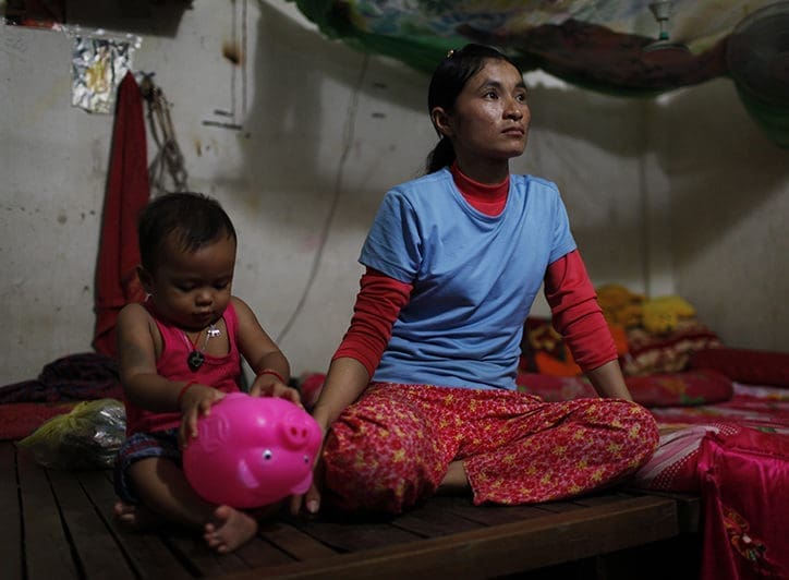 Sorn Sreynoun, 30 años, con su sobrino en la habitación alquilada que también comparte con su hermana y su cuñado. Su marido murió hace seis años, lo que hizo que buscara trabajo en ShenZhou. Tiene un hijo de 9 años del que se hace cargo su abuela. De los 61$ que gana al mes, Sorn gasta unos 30$ en comida para ella, y compra arroz a su madre que vive en su provincia natal.